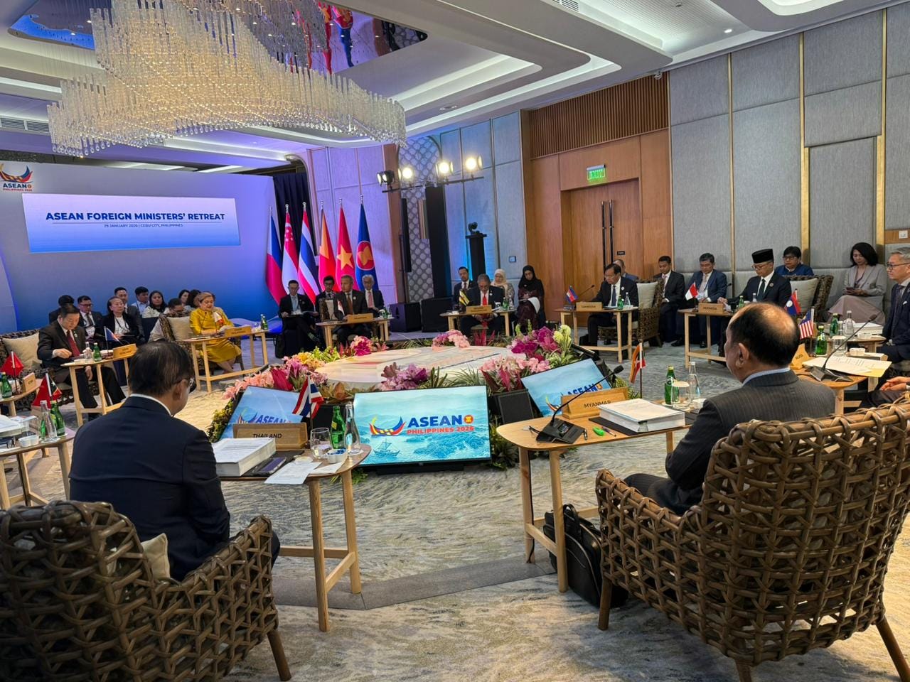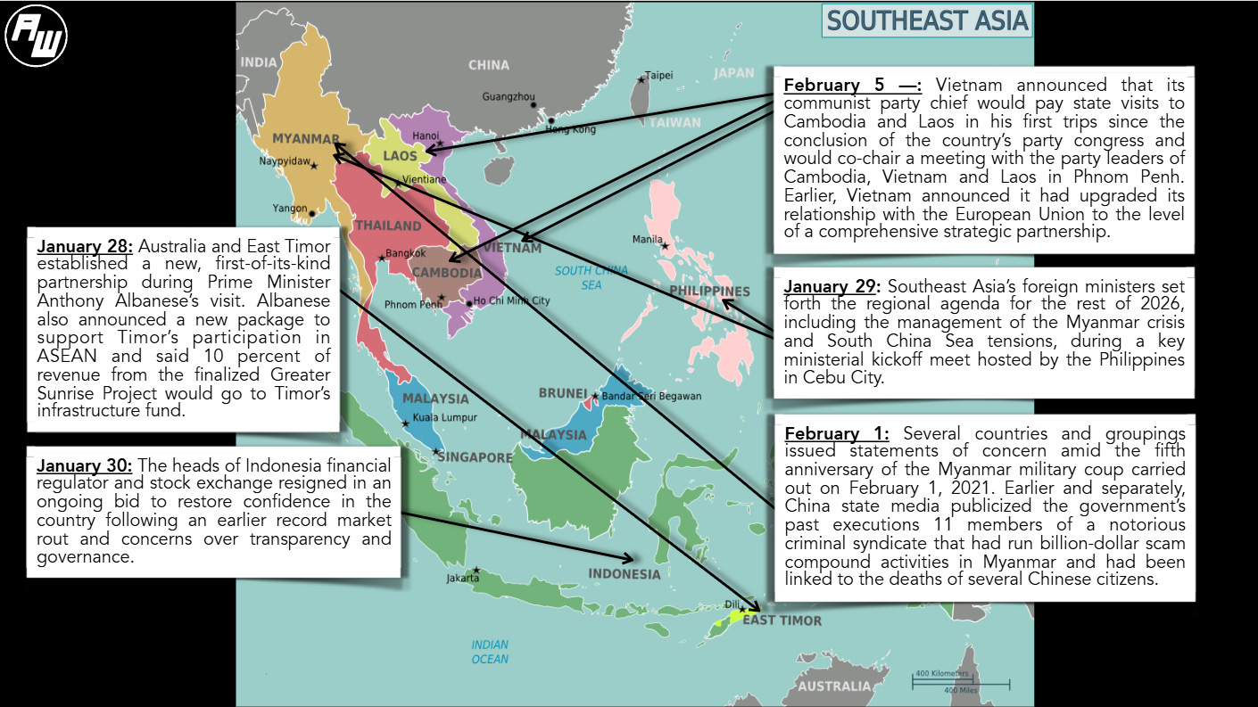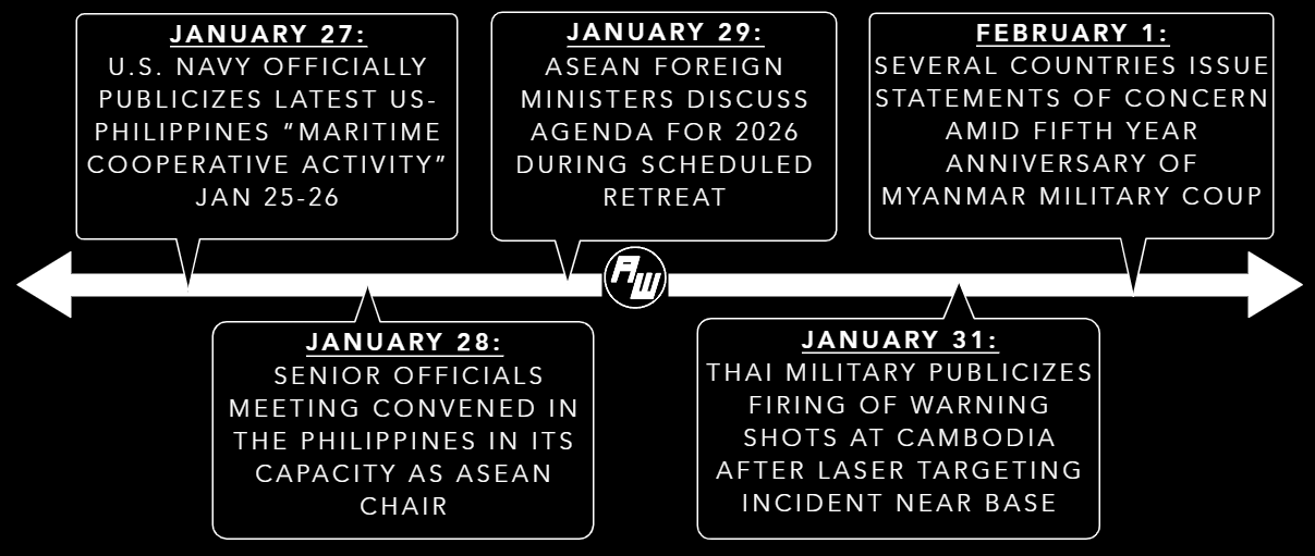 Southeast Asian countries set forth the foreign policy agenda for the rest of 2026 during a key ministerial kickoff meet1. The meeting came alongside other developments in key flashpoints as well as geoeconomic and geopolitical datapoints. The Philippines saw the publicizing of its latest ”maritime cooperative activity” amid ongoing speculation about the status of decades-old South China Sea code of conduct talks, with officials privately citing different views when asked about meaningful progress towards an end of 2026 push beyond publicized percentage completeness figures2. Meanwhile, a series of statements of concern were issued as Myanmar marked the fifth anniversary of the February 1, 2021 military coup, while Thailand’s military publicized warning shots fired at Cambodia after what it called laser targeting near a base ahead of coming polls as one top diplomat drew a distinction between national and party interests3.