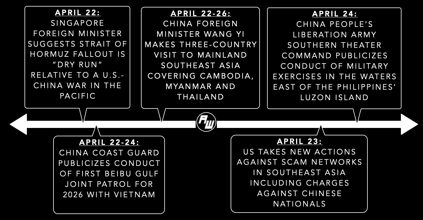 • The tour occurred amid scrutiny on the regional flashpoint landscape. Ahead of U.S. President Donald Trump’s trip to China, a senior official suggested that Washington had “more of an advantage” over Beijing in terms of economic vulnerability despite suggestions of mutual economic destruction4. Beyond the focus on China’s reactions to increasingly multinationalized U.S.-Philippines Balikatan exercises and implications for the South China Sea, the delayed issuance of an ASEAN chair statement on Myanmar also reinforced differences within the evolving intraregional conversation that some officials privately say has also been visible in the handling of Middle East conflict fallout thus far5.
