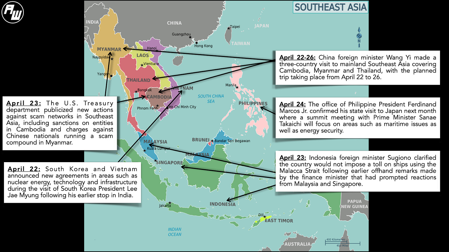 • China announced new inroads with Southeast Asian states following foreign minister Wang Yi’s three-country regional tour1. The inroads occurred alongside regional engagements by other key powers. While the focus this past week was on the publicizing of new U.S. steps against giant scam networks including those targeting Chinese nationals, other powers including the European Union were also taking steps of their own on a global challenge2. The outcomes following South Korea President Lee Jae Myung’s Vietnam visit also highlighted Seoul’s role in a wider mix of powers engaging in geoeconomic areas such as nuclear power plants amid the long list of agreements touted by both sides3.