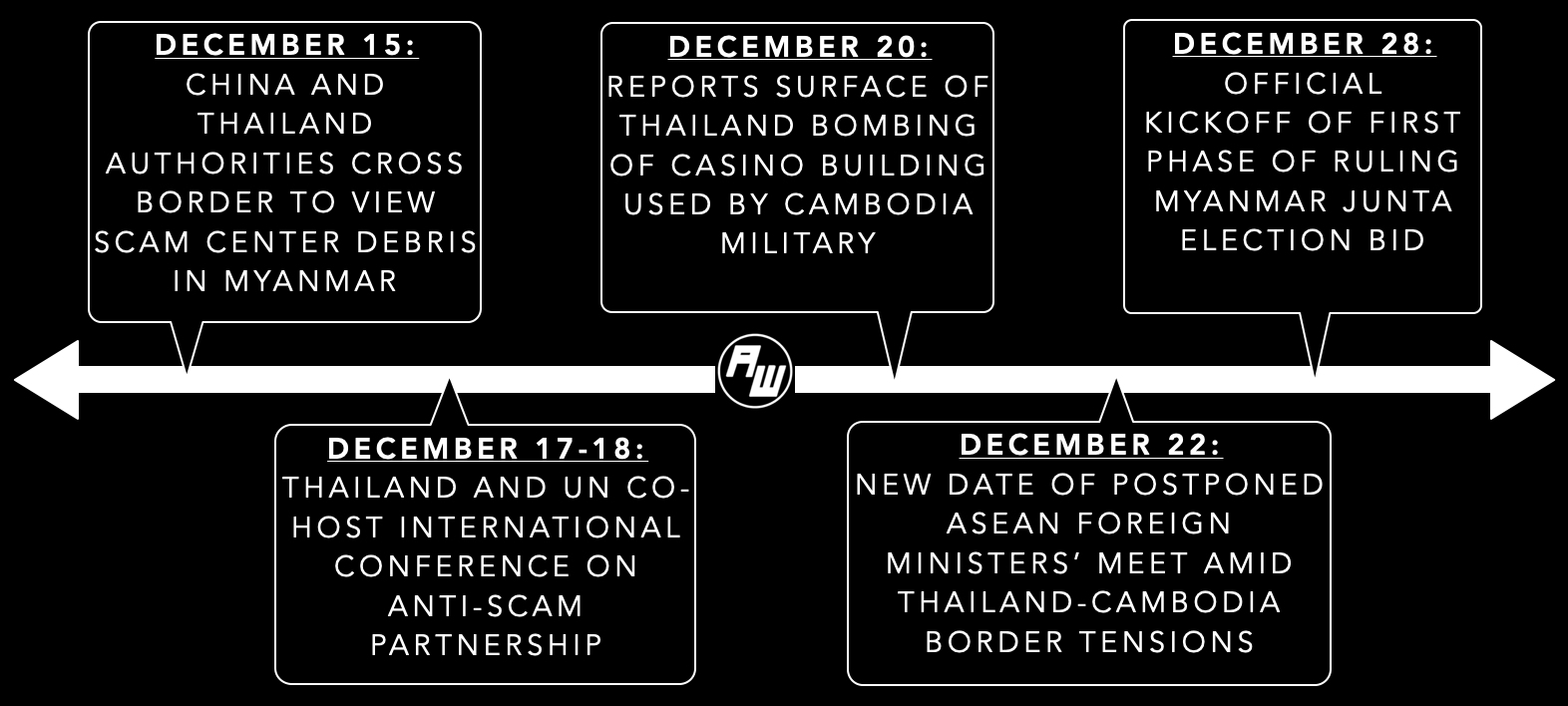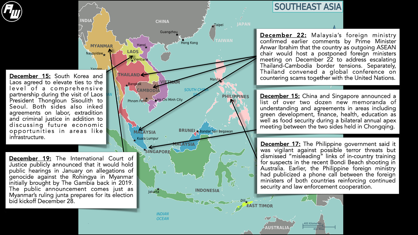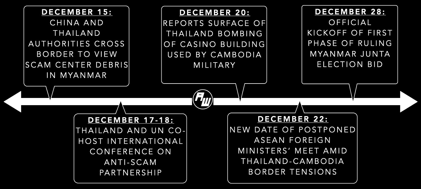 The United Nations and Thailand convened a international conference on the global partnership against scam networks1. The engagement to address the scams challenge — which has touched over a third of the world’s nations and resulted in over a trillion dollars in losses by one count — occurred amid a challenging regional environment at the end of 20252. A postponed special ASEAN foreign ministers’ meeting is testament to what one official described as “growing pains” in even convening regional consultations to discuss Thailand-Cambodia border tensions, beyond the focus on statements by key powers including China and the United States3. And as we pointed out in our newly-released ASEAN Wonk FuturePoints forecast for 2026, this comes amid a series of domestic political transitions in much of mainland Southeast Asia which includes the first phase of attempted elections by the ruling military junta in Myanmar as well as polls for Thailand set for early February.