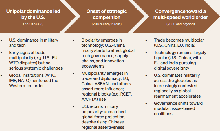 “India, Gulf states, and nations across Southeast Asia, Africa, and Latin America are leveraging modular coalitions and selective alignment to shape outcomes in trade, energy, and technology…yet their flexibility is constrained,” notes a new report published on global order following the meeting of the JPMorganChase International Council. The report argues that the international system is becoming more “multi-speed,” with areas like trade, technology, security and energy policy moving on different clocks and demanding agility from governments, businesses and investors alike (link to pdf).