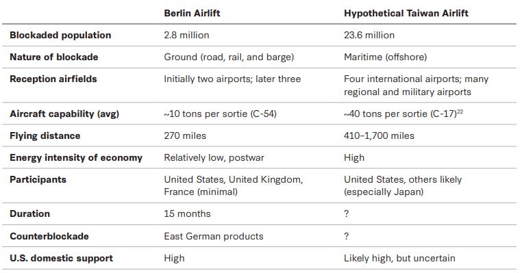 Graphic with Select Comparison Metrics For Berlin Airlift vs. Hypothetical Taiwan Airlift
