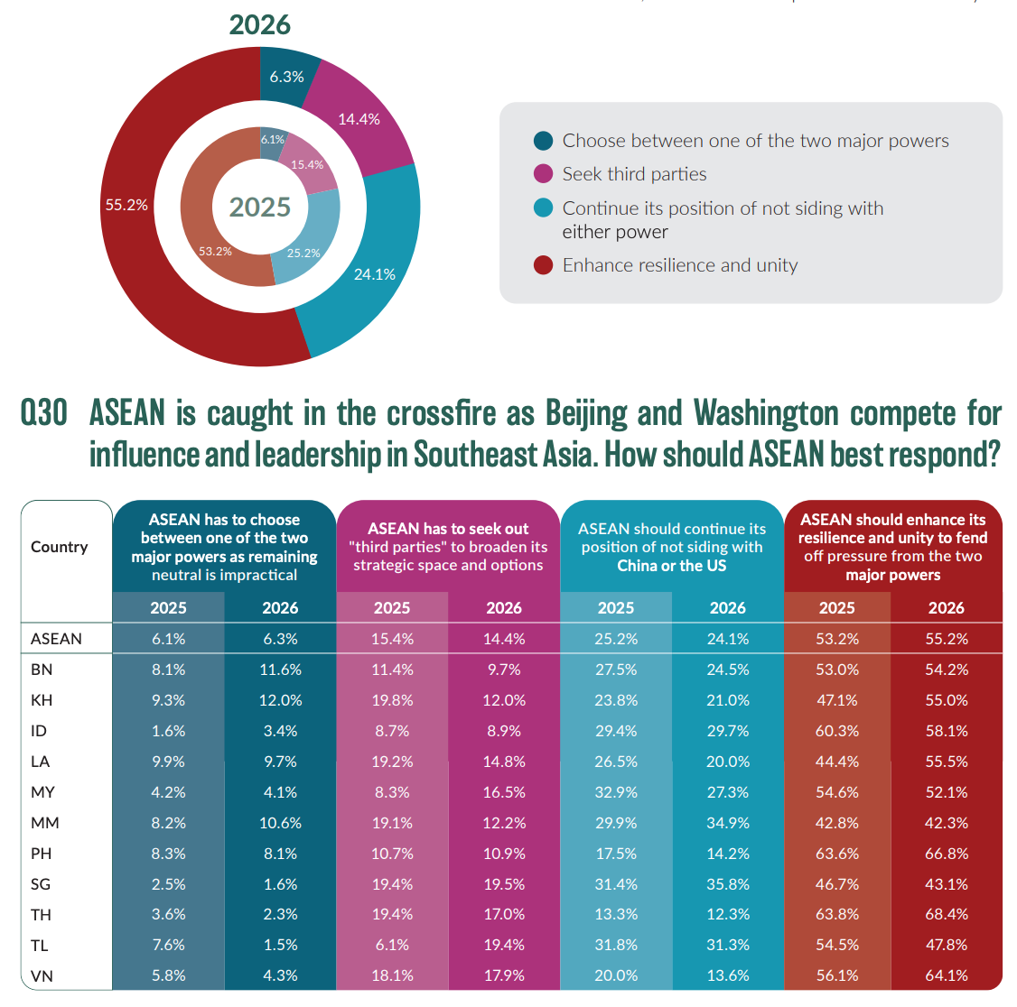 “Reversing last year’s trend, a slim majority of ASEAN respondents selected China (52.0%) over the US (48%) if the region were forced to align itself with one of the two strategic rivals,” according to a new iteration of an annual Southeast Asia survey report published by the ISEAS-Yusof Ishak Institute. Among other report toplines, global scam operations and the South China Sea are also identified as being among the biggest regional geopolitical concerns (link).