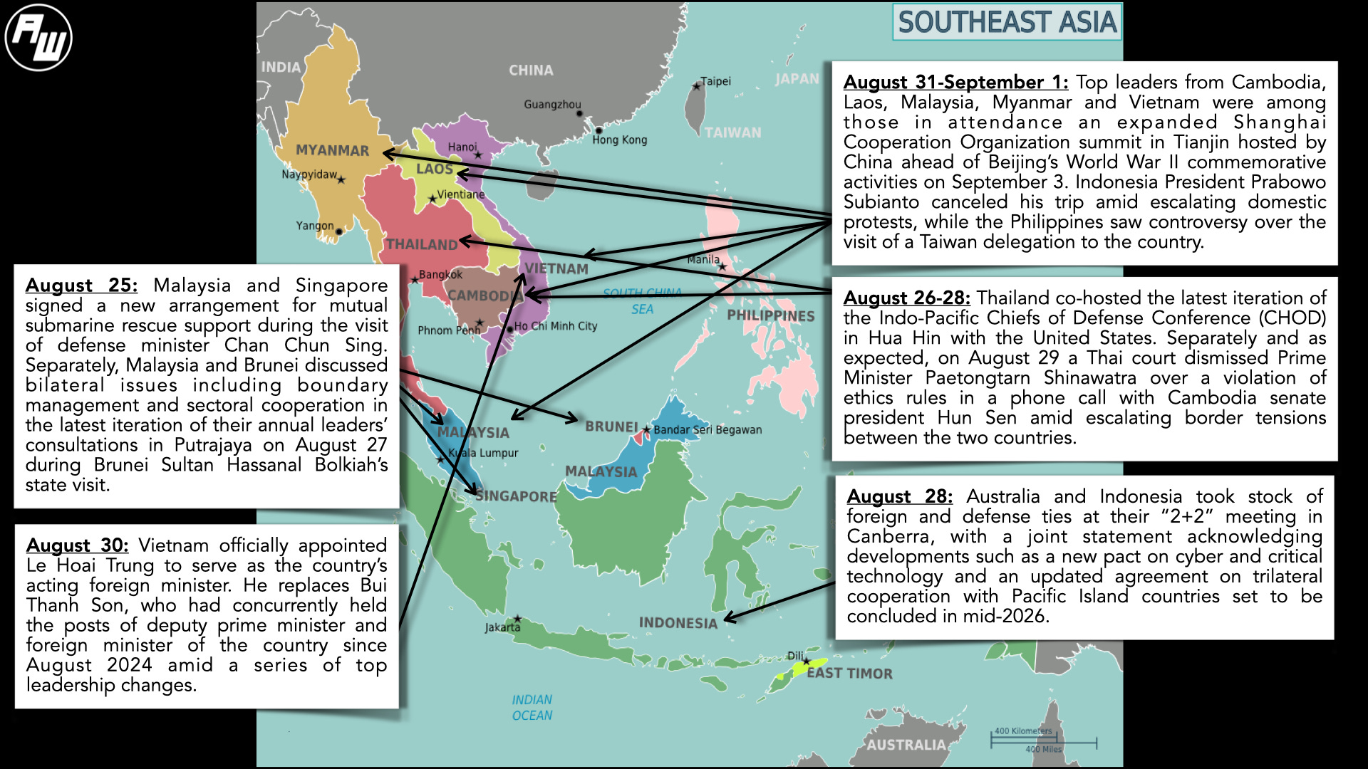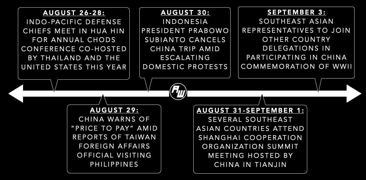 Representatives from the vast majority of Southeast Asian states began descending in China amid convening of the Shanghai Cooperation Organization (SCO) summit and commemorative activities tied to the Second World War1. The engagements have been closely watched given the presence of several prominent world leaders, including India’s Narendra Modi and Russia’s Vladimir Putin. On the Southeast Asia front, one regional official noted to ASEAN Wonk that China’s publicization of what was perceived as “tiered” levels of high regional attendance obscured factors such as unique proximity of the two separate engagements convened by Beijing — including a broader “SCO Plus” engagement with invitations targeted at individual ASEAN states not unlike past efforts with institutions like the BRICS — historical sensitivities for countries related to the nature of the commemorations as well as the differing cadence in individual bilateral ties2. Engagements were also affected by some last-minute changes, with the most prominent case in point being Indonesia President Prabowo Subianto’s cancelation amid escalating domestic protests3.
